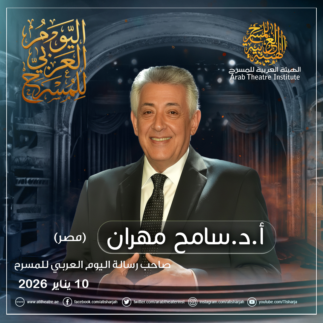 اختارت الهيئة العربية للمسرح الأستاذ الدكتور سامح مهران (مصر) ليكون صاحب رسالة اليوم العربي للمسرح الذي يصادف العاشر من يناير 2026، وياتي هذا الاختيار لما يتمتع به الدكتور مهران من مكانة رفيعة في المشهد المسرحي العربي، ولما يمثله من موقع معرفي مرجعي، ولدوره الفاعل في صياغة المشهد المسرحي مصرياً وعربياً.