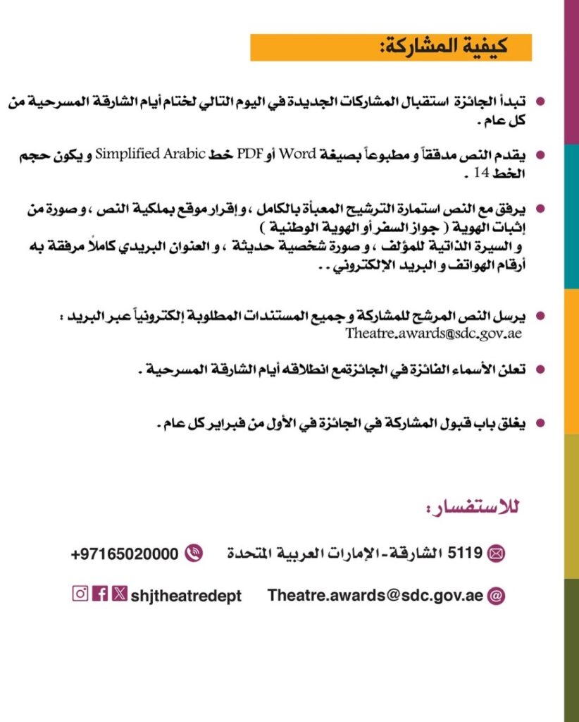 - ترسل المشاركات على البريد الالكتروني الخاص بالجائزة : Theatre.awards@sdc.gov.ae