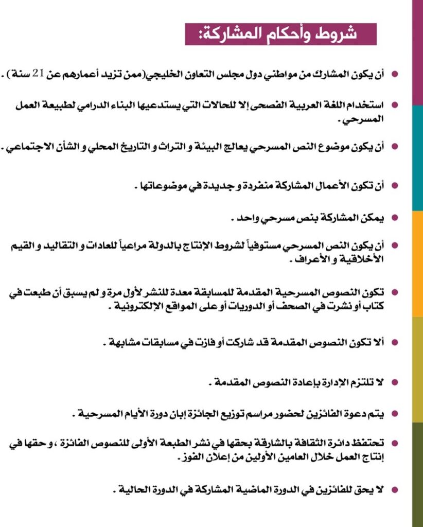 - أن يكون موضوع النص المسرحي يعالج البيئة والتراث والتاريخ المحلي والشأن الاجتماعي.
