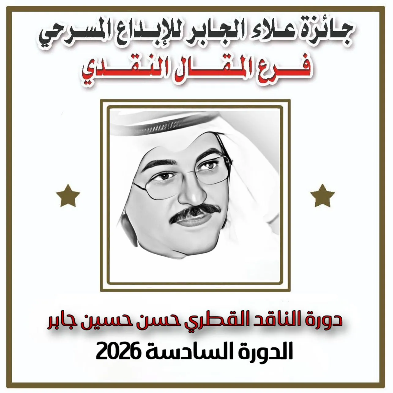 أعلن المنسق العام لجائزة علاء الجابر للإبداع المسرحي ،الكاتبة والناقدة د. صفاء البيلي، عن البدء بإطلاق أول فروع الجائزة في دورتها السادسة 2026، وهو فرع المقال النقدي، الذي سيكون هذا العام باسم الناقد القطري الراحل حسن حسين جابر .
