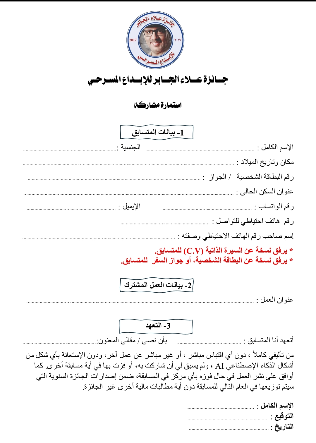 –تُرْسَل البيانات عبر الاستمارة الخاصة بالجائزة ، والمُرفَقة بالشروط ، ولا تُقبَل أية مشاركة دون تعبئة الاستمارة كلياً ، مع إرفاق جميع الطلبات المذكورة فيها.