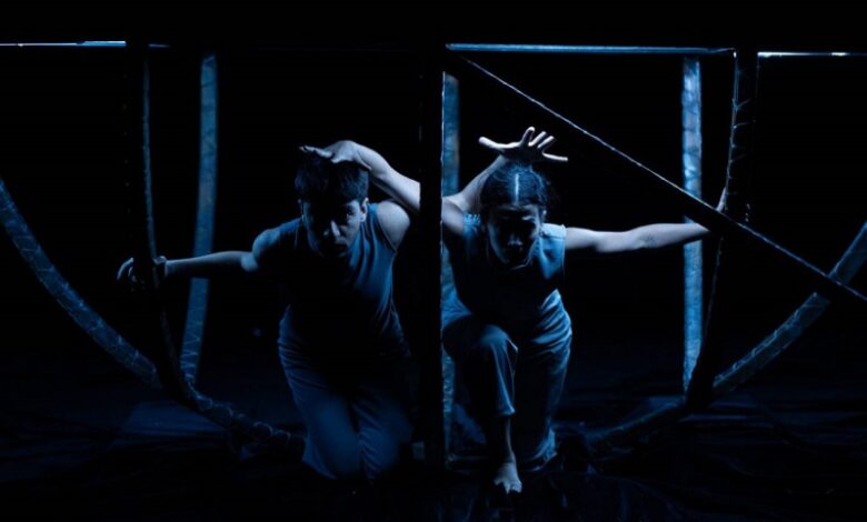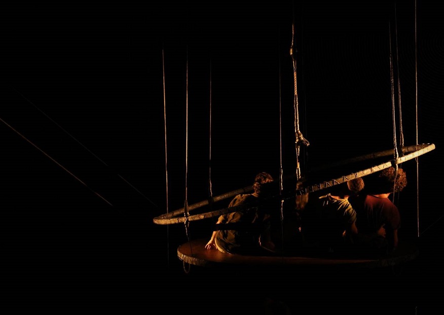 استند العرض الذي يمتد على نحو 30 دقيقة، إلى فضاء بصري مركزي شكّل محور الحركة والدراما، تمثل في كتلة حديدية مؤلفة من حلقتين متقاطعتين، بينهما دائرتان خشبيتان مثقوبتان من المنتصف، لتكوّن ثلاثة مستويات تفاعلت معها وعبرها الأجساد المؤدية بحركة دائرية متبادلة عبر الحبال التي تحمل الكتلة، في انسجام مع الضوء والموسيقى، ليصبح المشهد ذاته كائناً متحركاً نابضاً بالتوتر والانسياب في آن واحد.