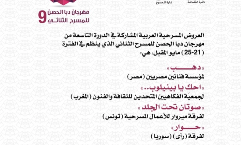 أعلن مهرجان دبا الحصن للمسرح الثنائي عن العروض المسرحية العربية المشاركة في الدورة التاسعة، والتي ستُقام خلال الفترة من 21 إلى 25 مايو المقبل بالإمارات.