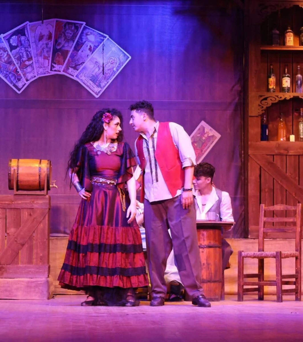 يبدأ العرض بدخول كارمن إلى الحانة، بفستانها الأحمر والأسود، وردة حمراء خلف أذنها، شعرها الغجري المنكوش، وأحمر شفاه يزيد حضورها البصري قوة. منذ اللحظة الأولى، تفرض كارمن نفسها على الخشبة قبل أن تنطق بكلمة. جمالها ليس بريئًا، بل واعٍ بذاته.